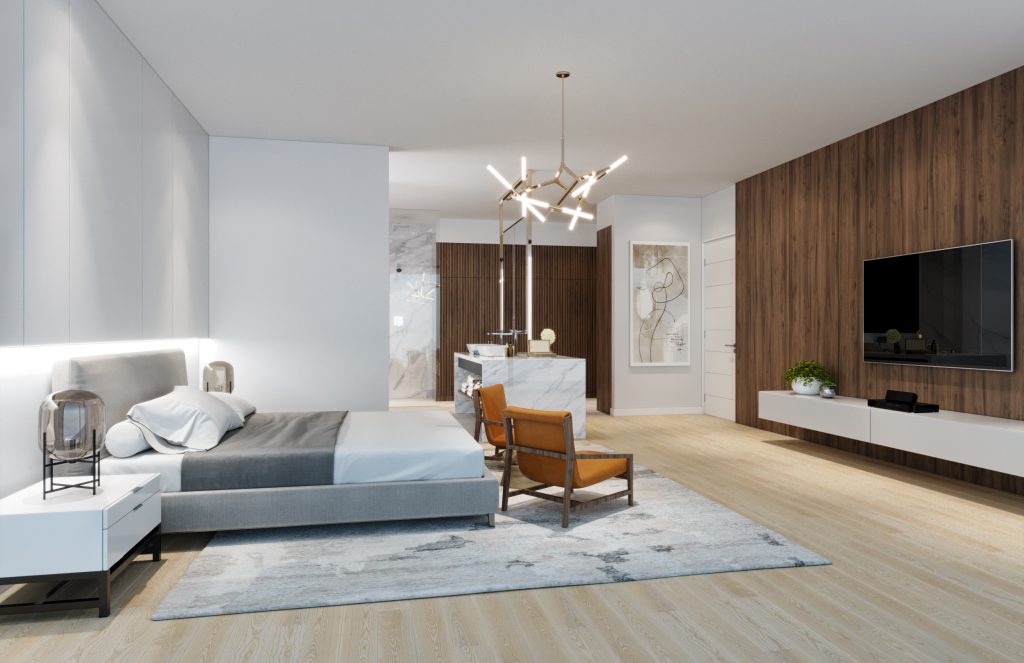 Large main bedroom with open plan bathroom and walk-in dressing room